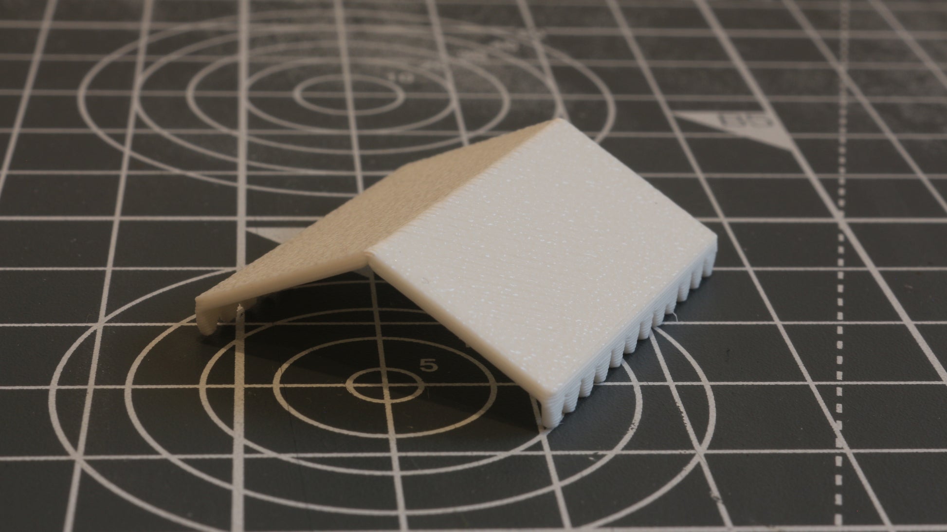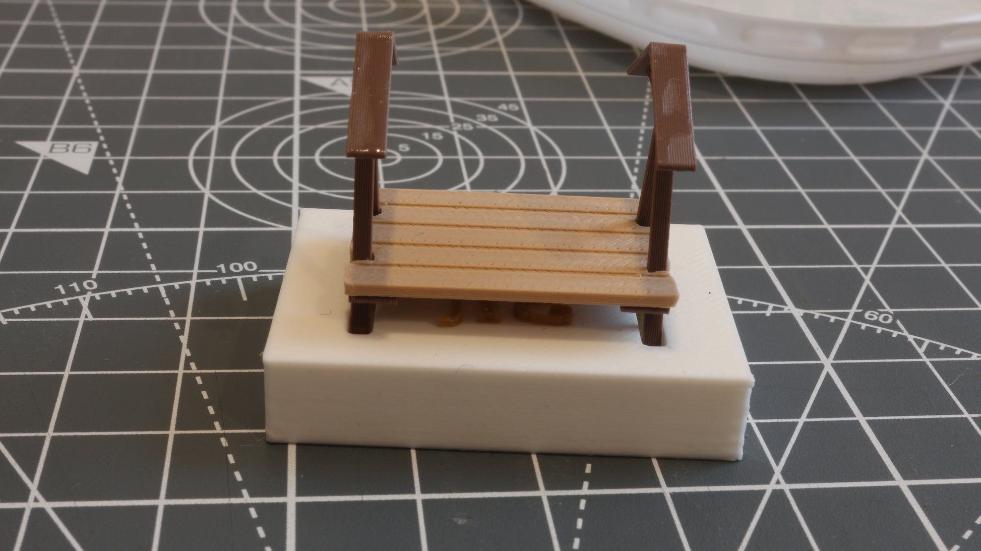 The set comprises of all the parts to assemble ten market stalls. 3D printed in PLA, the 'A' frame are printed in brown, the table tops in light wood colour and the canopy in white.